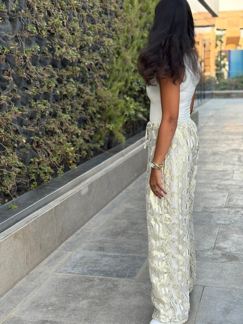 The pants bring together comfort and radiance. Crafted from premium Indian chiffon and padded from the inside for a smooth, flattering fit, they shimmer gently with every move.